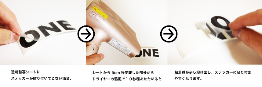 透明転写シートにステッカーが貼り付いてこない場合、シートから5cm程度離した部分からドライヤーの温風で10秒程あたためると粘着質が少し溶け出し、ステッカーに貼り付きやすくなります。
